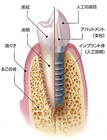 インプラントとは歯を失ったあとに、その失われた歯を補う治療法のことで、天然の歯に最も近い人工歯根を使います。この治療では顎の骨にインプラント体(人工歯根)を埋め込み、アバットメント(支台)を接続し、その上に人工の歯冠を被せます。見た目が自然で、入れ歯などとは違い、違和感なく噛むことができます。